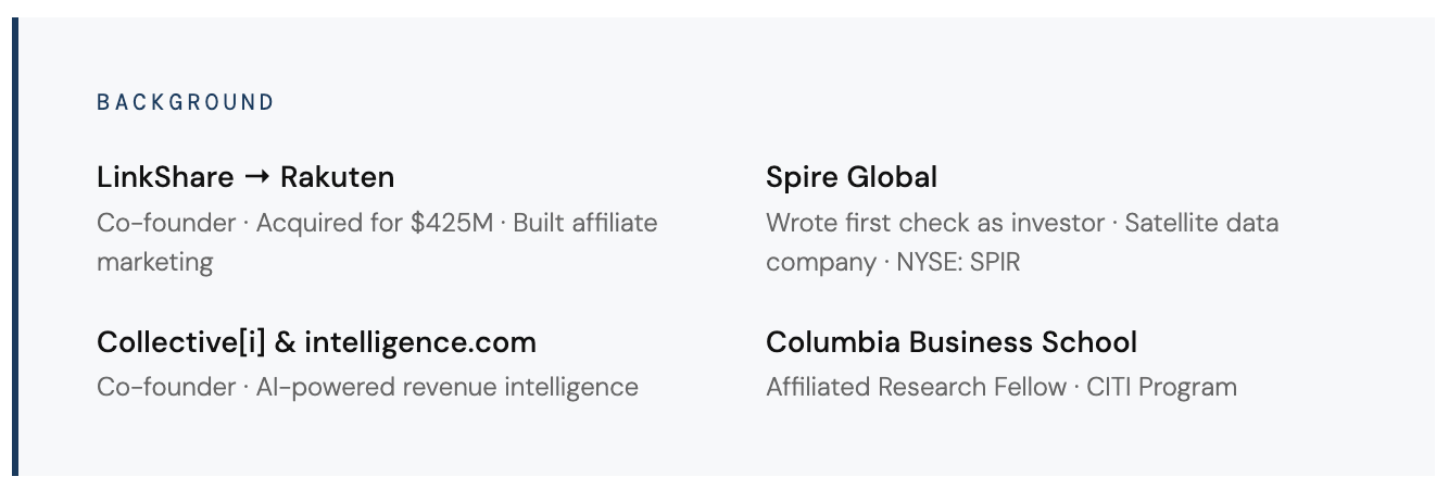 LinkShare started in 1996. Affiliate marketing wasn't a category yet. We made it one, sold to Rakuten for $425M, and somewhere along the way helped invent what we'd later call the influencer economy — though nobody called it that then. Spire put satellites in orbit. Small ones, tracking ships, planes, and weather systems in real time.