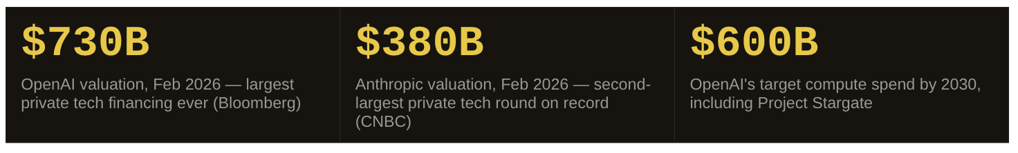 OpenAI has raised $110 billion at a $730 billion valuation — the largest private technology financing round ever recorded. Anthropic closed a $30 billion round at $380 billion in February 2026, making it the second-largest. Together, the two pure-play frontier model companies have raised more than $140 billion in the past twelve months alone, at a combined valuation approaching $1.1 trillion. Neither is publicly traded. Neither is profitable. Both are burning more than $5 billion per year.