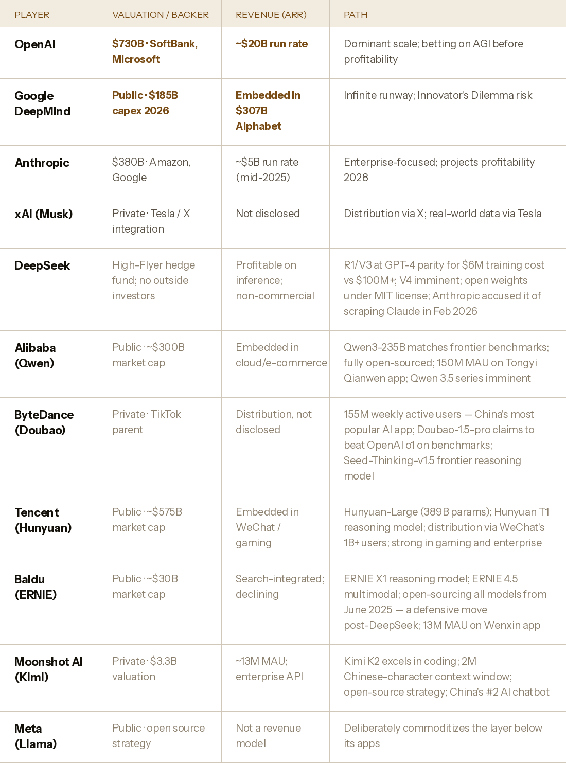 The consolidation logic is already visible among the Western players. In 2021, there were dozens of credible frontier model efforts. Today, the capital and talent required to train at the frontier level has concentrated the serious competition to three or four companies. The rest are building on top of those players' APIs — which is precisely the wrapper-company dynamic the bull case predicts will ultimately be absorbed. Cursor, at a $29 billion valuation with $500 million in ARR, is an impressive business. It is also, in the bull case's logic, a business that exists at the pleasure of the model providers whose capabilities it packages. When OpenAI launched Codex and Anthropic extended Claude Code, they were not just releasing products. They were serving notice.